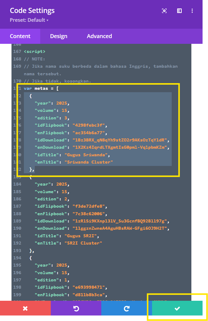 Cari variabel array bernama metas, lalu tambahkan entri baru pada posisi pertama dengan contoh format sebagai berikut: